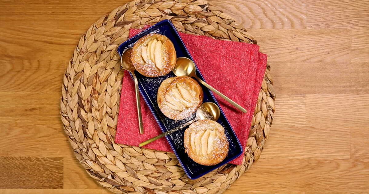 Étape 4 : Versez la préparation dans des moules préalablement beurrés et sucrés. Disposez les lamelles de pomme sur le dessus.
