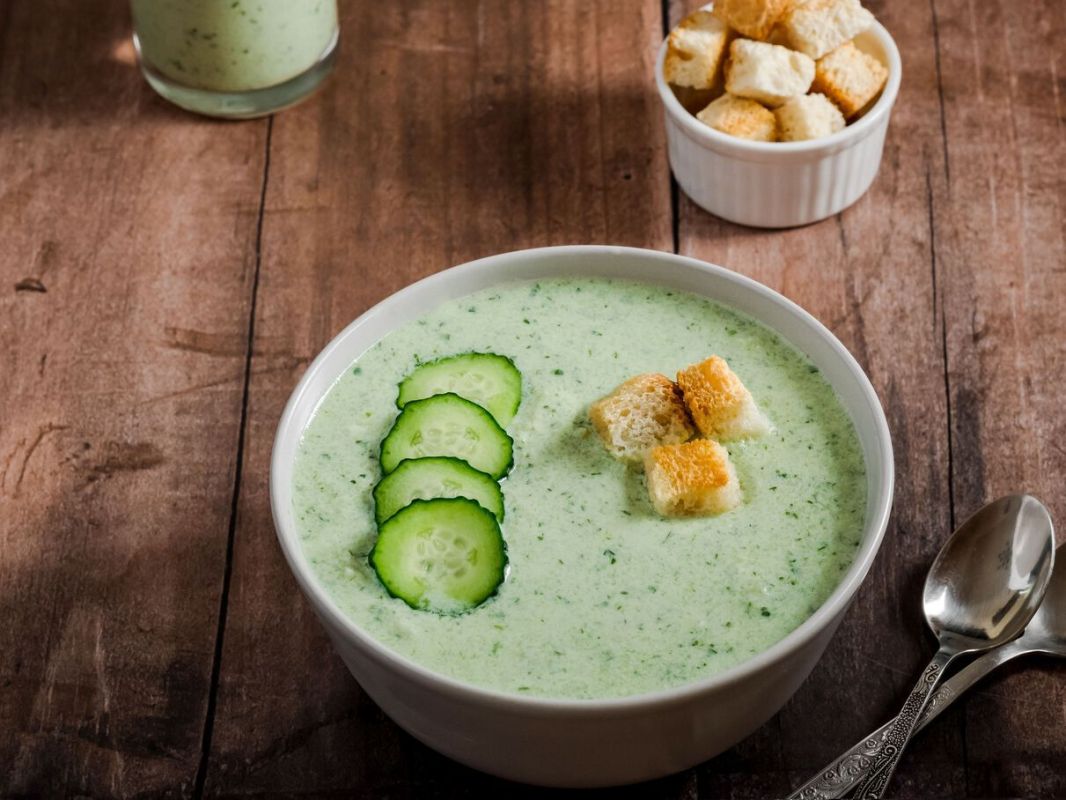 Pour 4 personnes : Peler 2 concombres, coupez-les et retirez les pépins. Ajoutez un bouquet de menthe dans un blender avec du fromage blanc et un peu d'épices. Mixez et réfrigérez avant de servir.