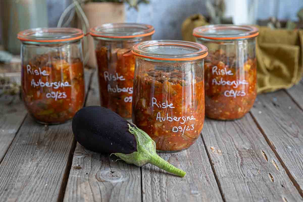 La préparation et cuisson de la riste d’aubergine prend environ 2h30, dont 1h30 de stérilisation en bocaux. Si vous choisissez de ne pas stériliser, mijotez 30 à 45 minutes supplémentaires.