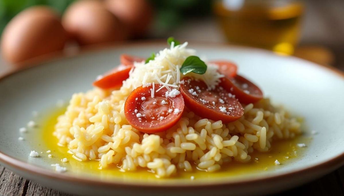 Pour servir, optez pour des assiettes creuses afin de maintenir la chaleur. Assurez-vous de bien mélanger le riz pour que chacun puisse apprécier sa texture crémeuse. Pour une touche d'élégance, parsemez de parmesan frais et décorez de quelques feuilles de basilic.