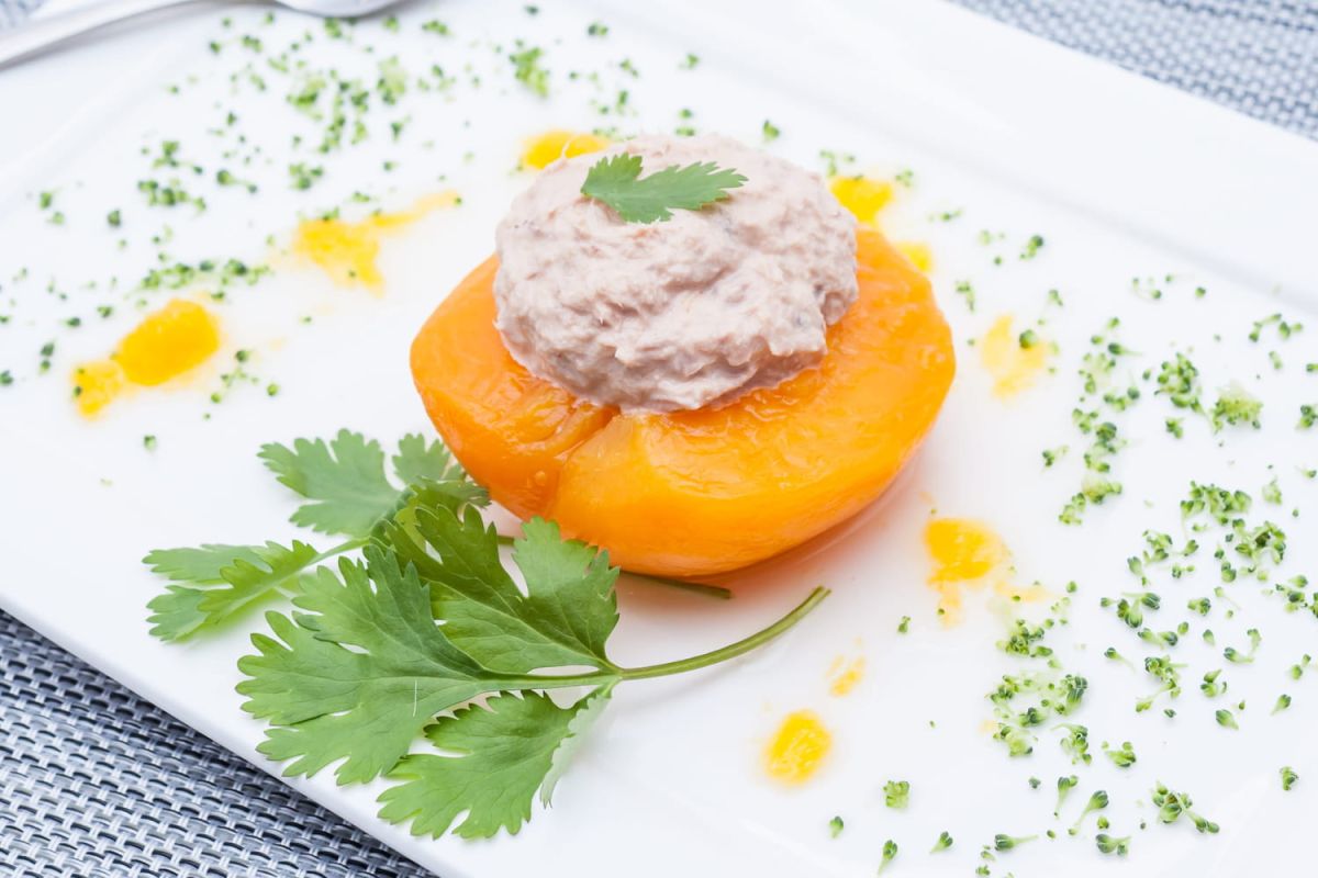Mélangez la chair de thon avec la mayonnaise, puis farcissez les oreillons de pêche. Une touche de persil pour la finition, et le tour est joué – c’est rapide et innovant !