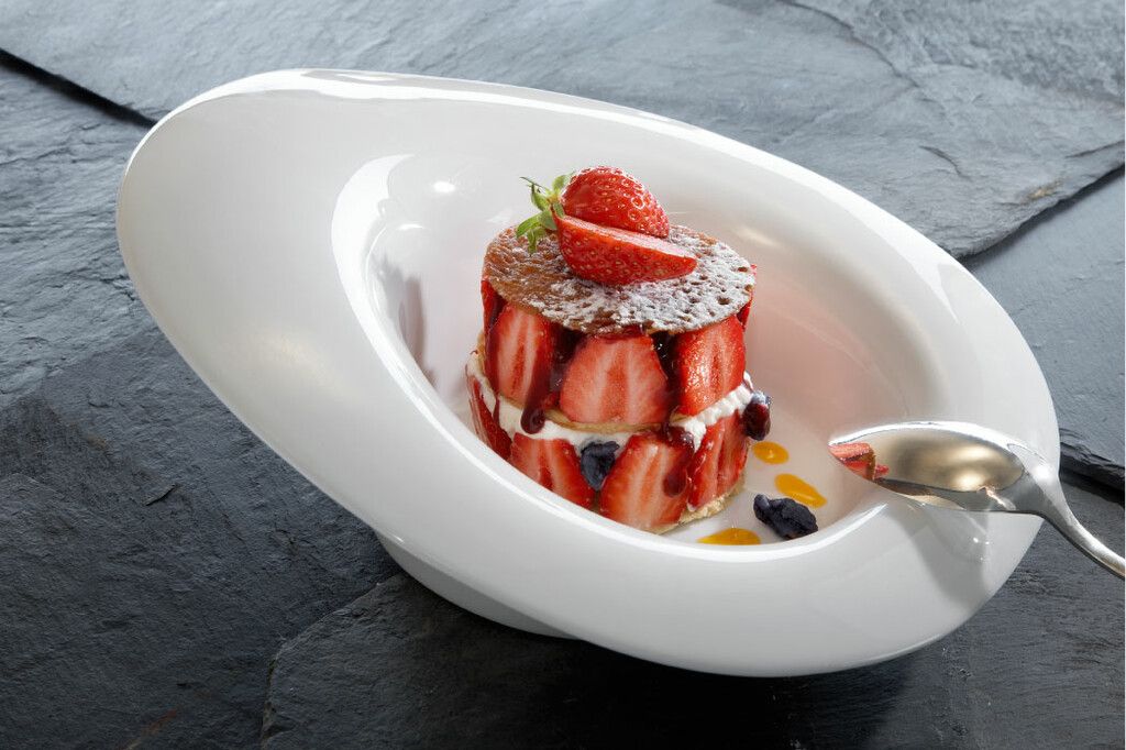 5. Sur une assiette, disposez un sablé breton, entourez-le de fraises, ajoutez de la crème au gros lait au centre, puis nappez de coulis. Terminez en plaçant un rond d’arlette sur le dessus, et si vous le souhaitez, ajoutez un peu de crème et une cuillère de sorbet à la fraise.