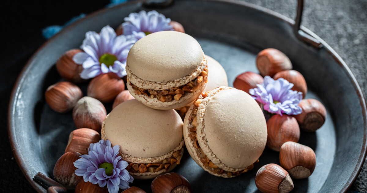 - Montage des macarons : Garnissez la moitié des coques de ganache, ajoutez du praliné, puis recouvrez avec une autre coque.