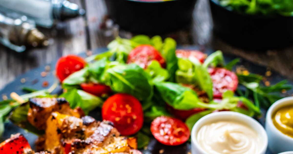 - Servez les brochettes sur une assiette avec la salade assaisonnée, accompagnées de pains pitas et de la sauce à l’ail.