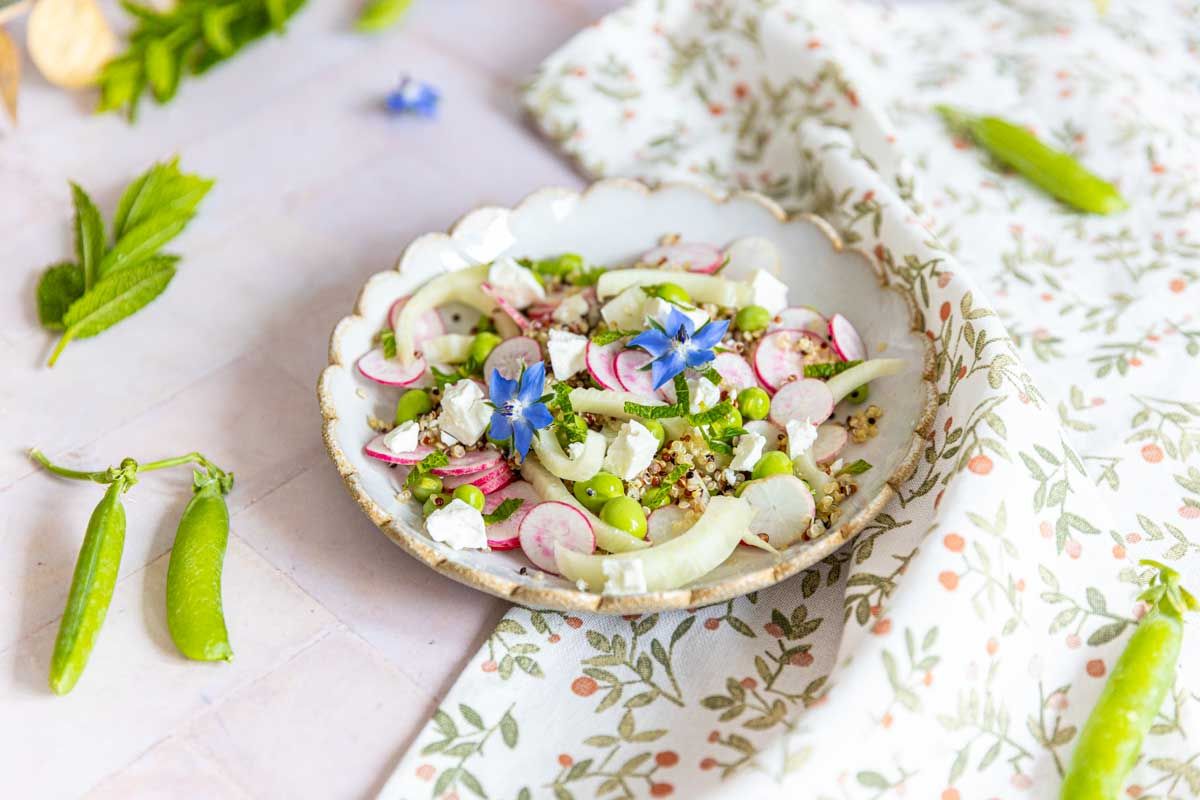 Cette recette de taboulé de quinoa est un vrai festival de légumes printaniers tels que les radis, les petits pois, le fenouil et le concombre. La combinaison de ces ingrédients apporte croquant et fraîcheur, tout en étant rehaussée par une vinaigrette citronnée à la menthe. Pour une touche encore plus de fraîcheur, n'hésitez pas à ajouter des petits pois crus, cueillis directement si possible !