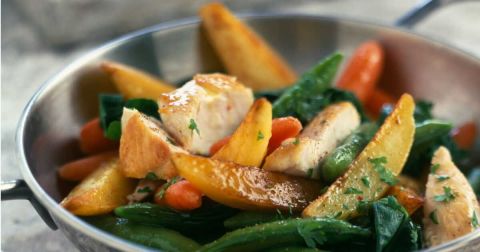 Pour accompagner ce plat, un Riesling léger complète agréablement les saveurs du poulet et des légumes.